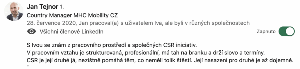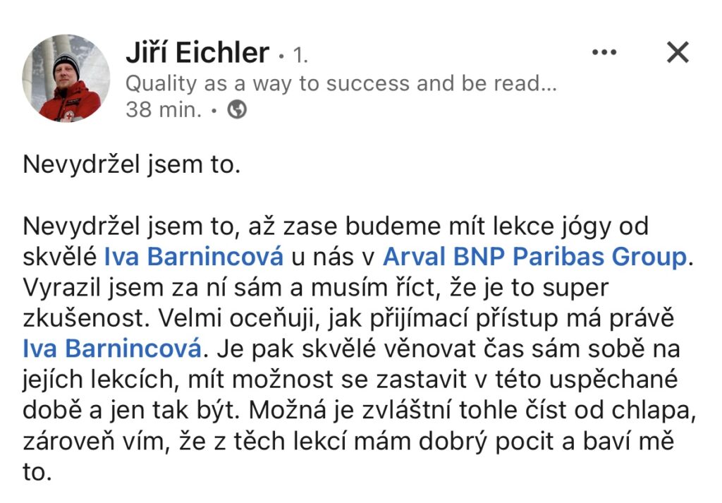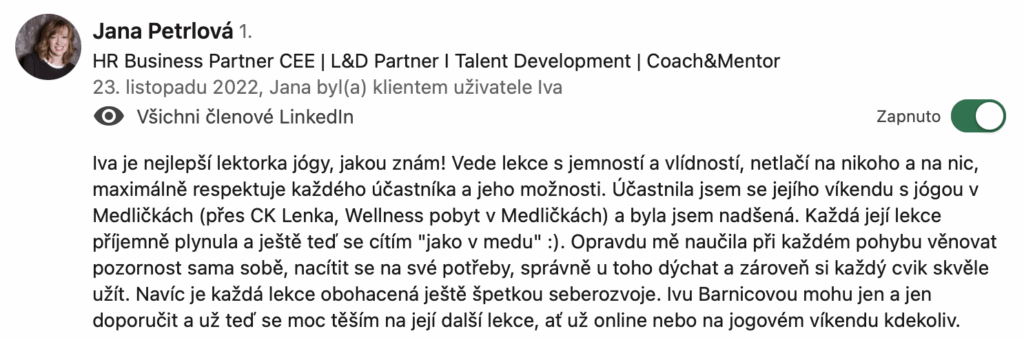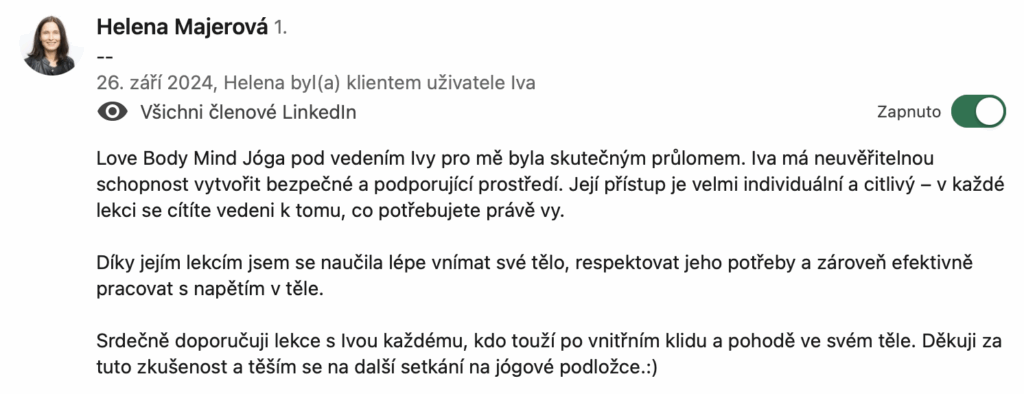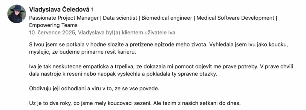 Spolupráce s Ivou je pro mě opravdu výjimečná. Je to nesmírně pozitivní člověk, který dokáže vytvořit bezpečný a přátelský prostor, kde se člověk cítí přirozeně a v klidu. Její koučink metodou Love Body Mind mi pomohl znovu se naladit na sebe, získat větší vnitřní rovnováhu a udělat důležitá rozhodnutí s větší jistotou. Iva má dar naslouchat, vnímat souvislosti a jemně vést k tomu, co je pro člověka opravdu důležité. Její přístup je lidský, citlivý, ale zároveň praktický – žádné prázdné fráze, ale konkrétní kroky, které mají smysl. Díky Ivě jsem se posunula nejen profesně, ale hlavně osobně. Její koučink bych doporučila každému, kdo hledá podporu, inspiraci a pozitivní energii na cestě k sobě.