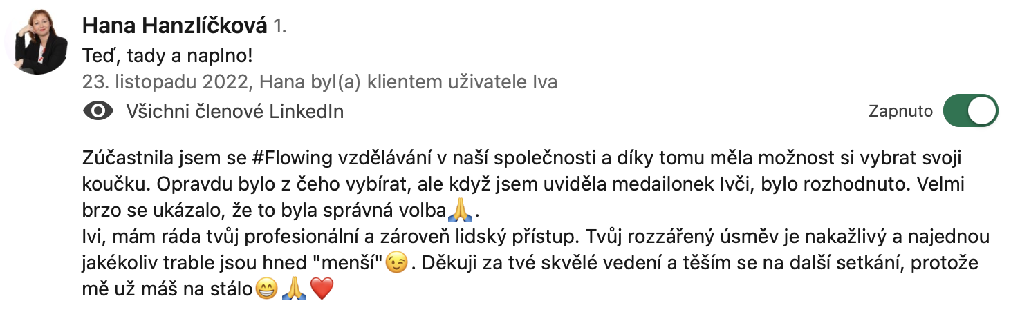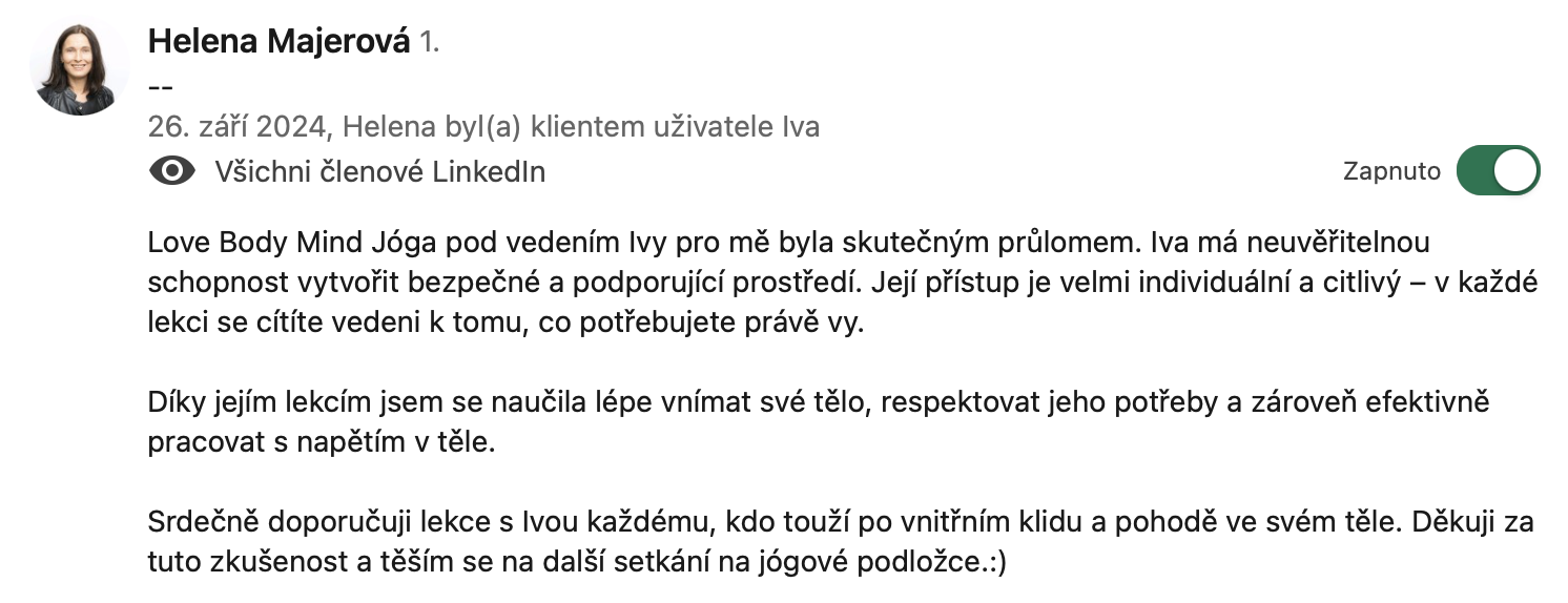 Spolupráce s Ivou je pro mě opravdu výjimečná. Je to nesmírně pozitivní člověk, který dokáže vytvořit bezpečný a přátelský prostor, kde se člověk cítí přirozeně a v klidu. Její koučink metodou Love Body Mind mi pomohl znovu se naladit na sebe, získat větší vnitřní rovnováhu a udělat důležitá rozhodnutí s větší jistotou. Iva má dar naslouchat, vnímat souvislosti a jemně vést k tomu, co je pro člověka opravdu důležité. Její přístup je lidský, citlivý, ale zároveň praktický – žádné prázdné fráze, ale konkrétní kroky, které mají smysl. Díky Ivě jsem se posunula nejen profesně, ale hlavně osobně. Její koučink bych doporučila každému, kdo hledá podporu, inspiraci a pozitivní energii na cestě k sobě.